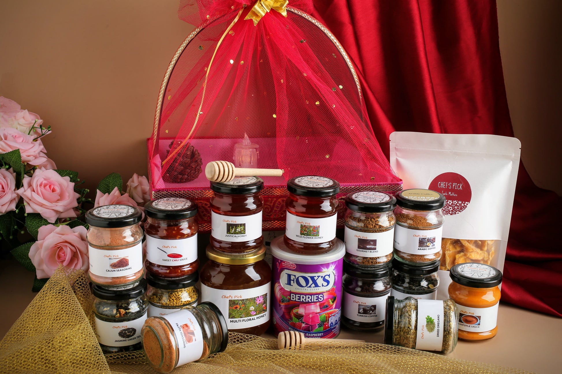 A charming pink basket filled with delicious treats—premium honey, aromatic coffee, dried fruits, and flavorful sauces. Perfect for gifting or indulging in a little everyday luxury.
